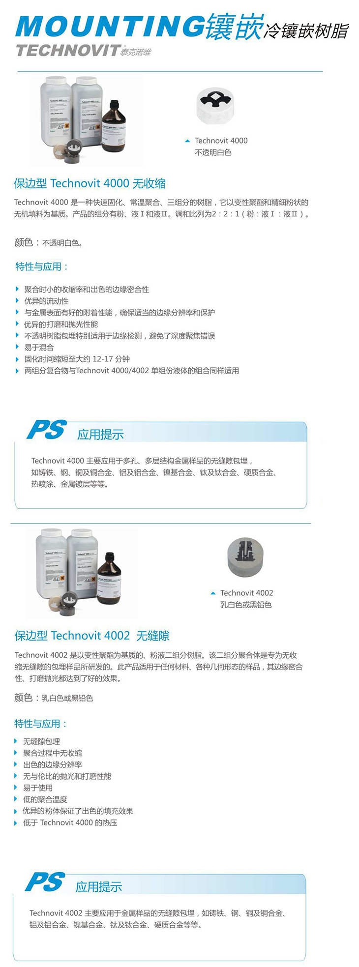 Technovit 4000 是一種快速固化、冷鑲嵌,基于改性聚酯和粉末形式的超細無機填料。