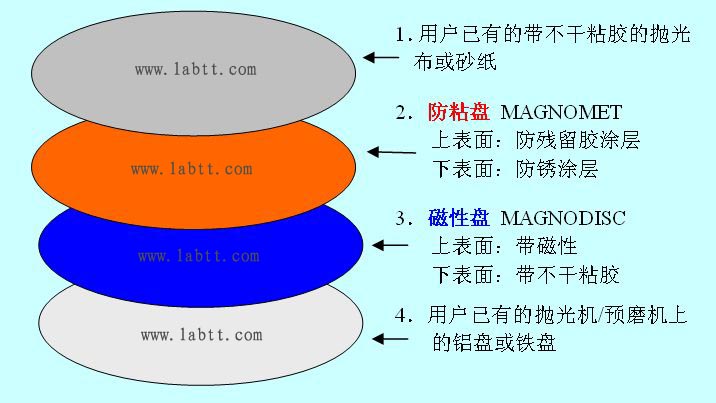 3. 利用用戶現使用的拋光布或砂紙帶下表面的不干粘膠,將拋光布或砂紙粘接在防粘盤(MAGNOMET)的上表面(該面光滑,帶防殘留膠涂層,不光滑的另一面與磁性盤接觸);